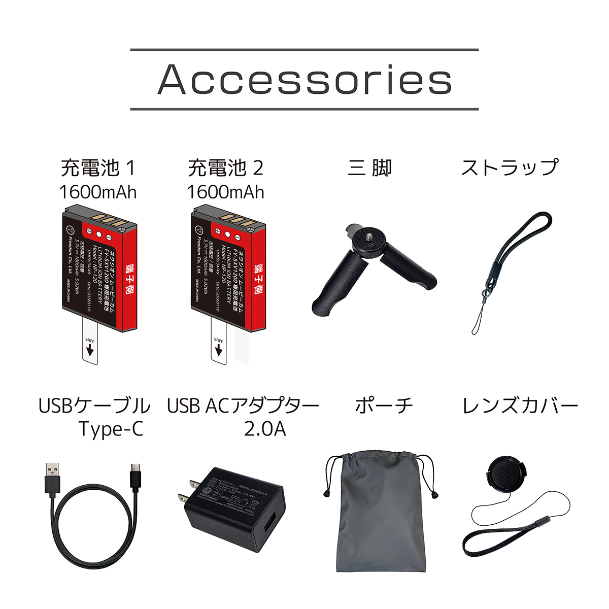 | 付属品 | 充電池 NP-120(2)、レンズカバー(1)、三脚(1)、USBケーブル(1)、ポーチ(1)、 ストラップ(1)、USB ACアダプター(1)、取扱説明書(1)、保証書(1) |